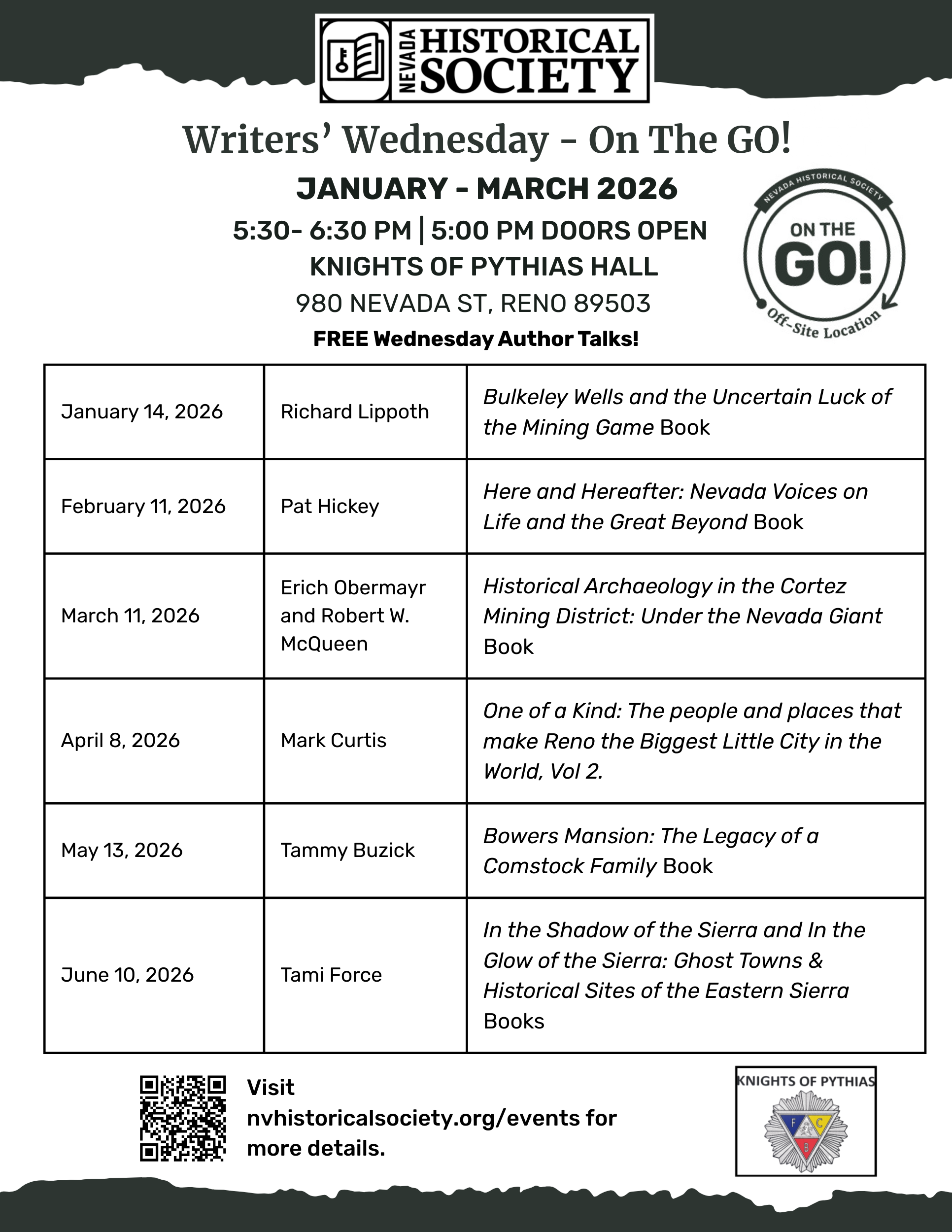 We want to thank our partners, the Washoe County Library System and Sierra View Library (SVL), for hosting our NHS Nevada History – On The GO! and the Knights of Pythias for hosting our NHS Writers’ Wednesday – On The GO! and Nevada Sunset Winery (NSW), for hosting our NHS Artown 2026- On The GO! in allowing NHS to provide free off-site lectures during our building renovations.