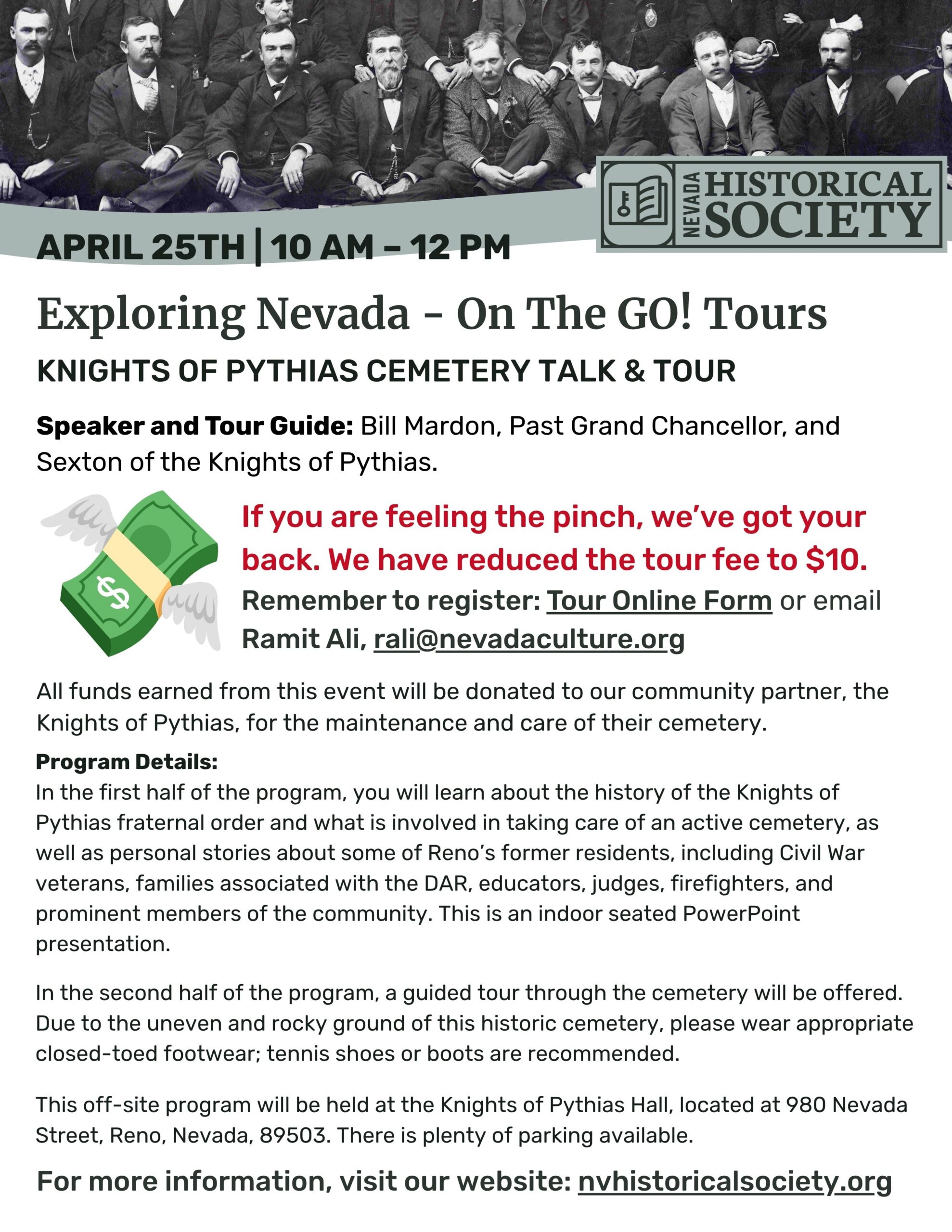 Exploring Nevada – On The GO! Tours: the Nevada Historical Society partners with community organizations to offer a few historical off-site tours while the NHS is closed for building renovations. Don’t miss your chance to attend our inaugural off-site tour, Knights of Pythias Cemetery Talk & Tour on Saturday, April 25, 2026. All funds earned from this tour will be donated to the Knights of Pythias to help with the care of their cemetery. The registration fee is $10 dollars to be paid at the door.